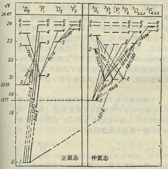 1868年在太阳日珥光谱中首次观察到了一条波长为587.5nm的黄色谱线,这条谱线与钠原子的D1和D2线非常接近,因此称为D3线。这条谱线不属于当时已知元素的光谱线,被认为是一种新元素的光谱线,这种元素称作氦。 氦原子是由原子核和两个电子组成的原子,是最简单的多点子原子。实验发现,它的光谱也有各个谱线系,但所不同的是氦原子的各线系有两套谱线。其能级和跃迁如图。 |
